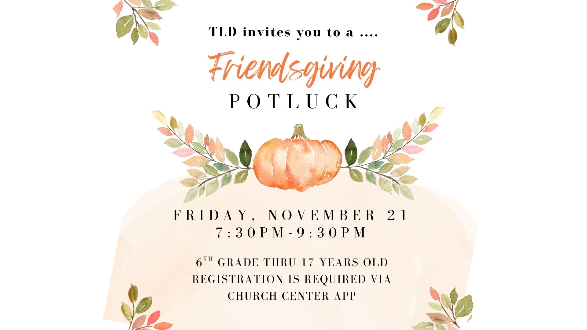 REGISTER HERE to join TLD and all youth from 6th grade to age of 17 for a Friendsgiving Potluck on Friday, November 21 at 7:30pm. It’s going to be an awesome night filled with great food, games, prizes, music, and fellowship!