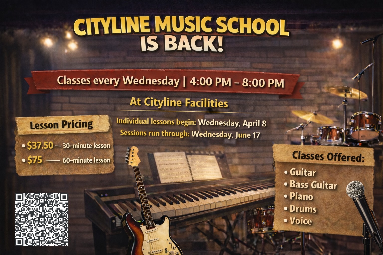 REGISTER HERE – CITYLINE MUSIC SCHOOL IS BACK! Lessons every Wednesday |4:00 PM–8:00 PM at our Cityline Facilities for ages 5 and up.  Individual lessons begin on Wednesday, April 8 and runs through Wednesday, June 17.
