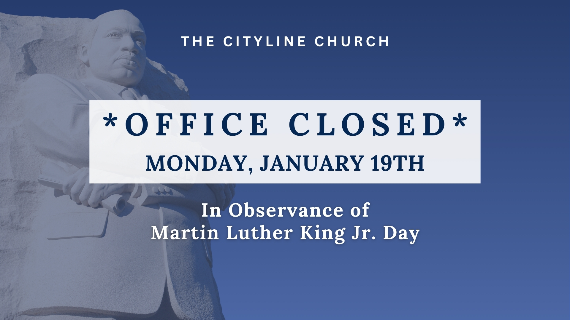 Posted on December 27, 2025 Posted By: Staff Categories: News In observance of Martin Luther King Jr’s Day, the CLC Office will be closed on MONDAY, JANUARY 19th.
